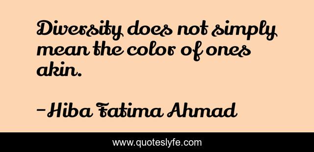 This page presents the quote "Diversity does not simply mean the color of ones akin.". Author of this quote is Hiba Fatima Ahmad. This quote is about diversity, prejudice, racial-discrimination,.