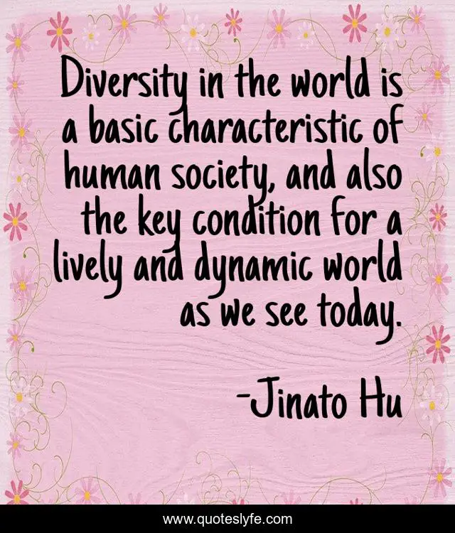 This page presents the quote "Diversity in the world is a basic characteristic of human society, and also the key condition for a lively and dynamic world as we see today.". Author of this quote is Jinato Hu. This quote is about world, diversity, today,.