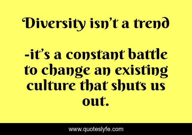 "it’s a constant battle to change an existing culture that shuts us out. Quotes." Quoteslyfe.com, 2025. Fri. 05 Dec. 2025. <https://www.quoteslyfe.com/quote/Diversity-isn-t-a-trend-259066>.
