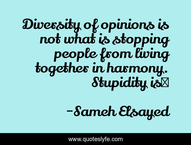 This page presents the quote "Diversity of opinions is not what is stopping people from living together in harmony. Stupidity isز". Author of this quote is Sameh Elsayed. This quote is about experience-plus, diversity, adam-elsayedtood, joumana-ezz, noha-abdel-hameed, stupidity, human-development,.