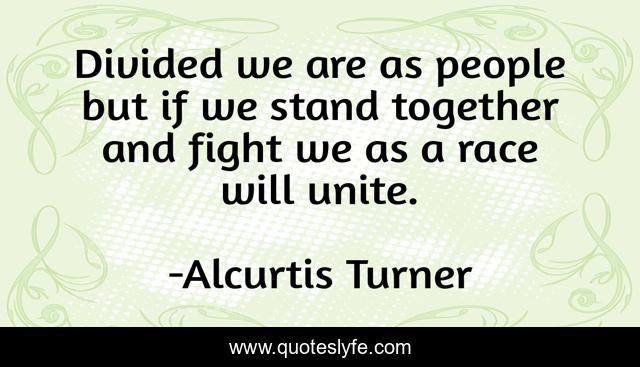This page presents the quote "Divided we are as people but if we stand together and fight we as a race will unite.". Author of this quote is Alcurtis Turner. This quote is about black-people-in-america, confidence, family, race-and-racism-in-america, positive, black-and-white, motivational, optimistic, inspirational,.