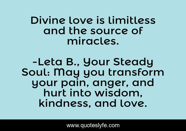 This page presents the quote "Divine love is limitless and the source of miracles.". Author of this quote is Leta B., Your Steady Soul: May you transform your pain, anger, and hurt into wisdom, kindness, and love.. This quote is about divine-love, divine, spirituality, inspirational, enthusiasm,.
