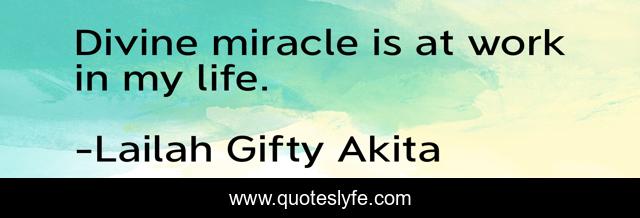 This page presents the quote "Divine miracle is at work in my life.". Author of this quote is Lailah Gifty Akita. This quote is about divine-command-theory, life, divine-self, divine, divine-favour, work, my-life-story, divine-intuition, divine-grace,.