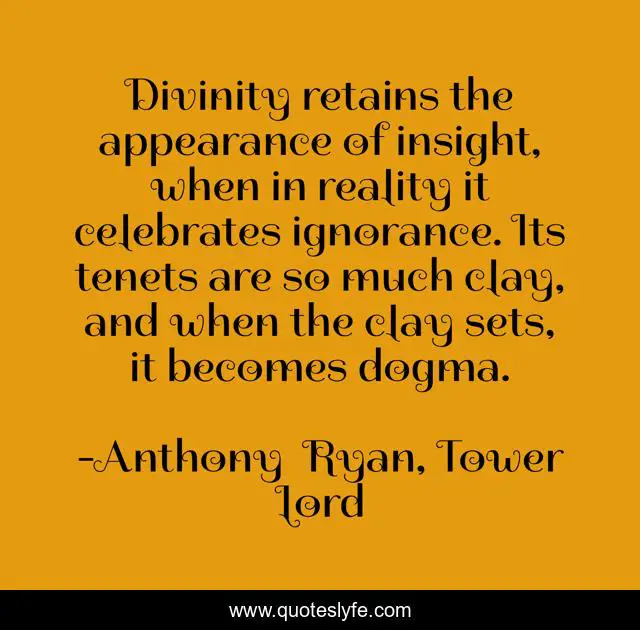 This page presents the quote "Divinity retains the appearance of insight, when in reality it celebrates ignorance. Its tenets are so much clay, and when the clay sets, it becomes dogma.". Author of this quote is Anthony Ryan, Tower Lord. This quote is about firm, set, seeming, gods, insight, tenet, follower, divine, mold,.