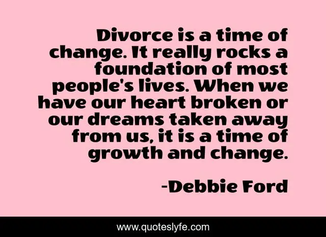This page presents the quote "Divorce is a time of change. It really rocks a foundation of most people's lives. When we have our heart broken or our dreams taken away from us, it is a time of growth and change.". Author of this quote is Debbie Ford. This quote is about growth, change, time,.
