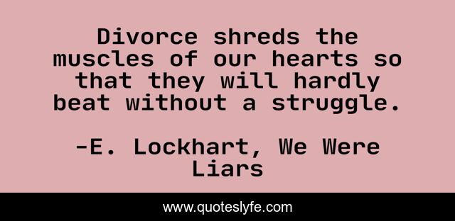 This page presents the quote "Divorce shreds the muscles of our hearts so that they will hardly beat without a struggle.". Author of this quote is E. Lockhart, We Were Liars. This quote is about divorce, divorce-separation-children, we-were-liars,.