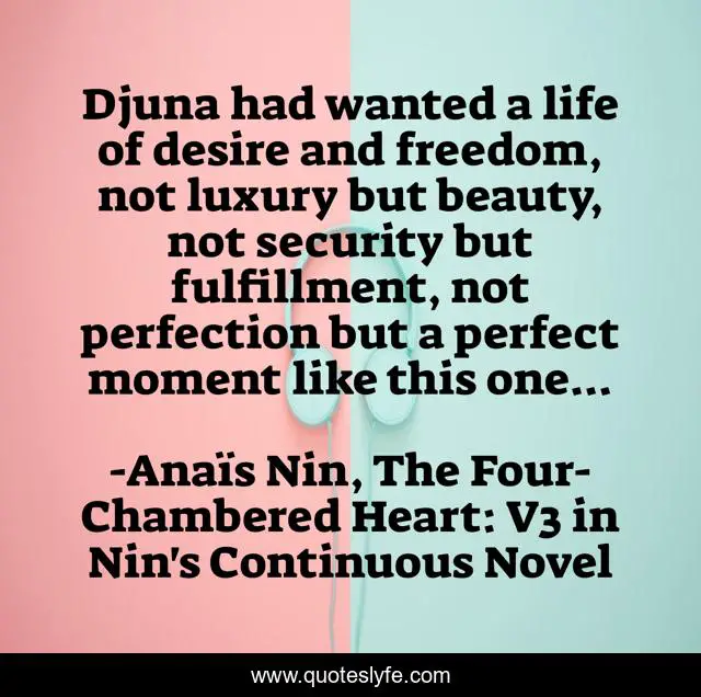 This page presents the quote "Djuna had wanted a life of desire and freedom, not luxury but beauty, not security but fulfillment, not perfection but a perfect moment like this one...". Author of this quote is Anaïs Nin, The Four-Chambered Heart: V3 in Nin's Continuous Novel. This quote is about life, perfection, beauty,.