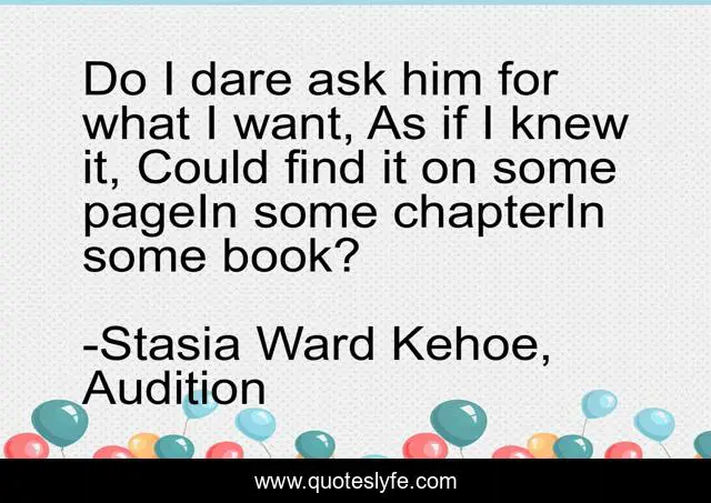 This page presents the quote "Do I dare ask him for what I want, As if I knew it, Could find it on some pageIn some chapterIn some book?". Author of this quote is Stasia Ward Kehoe, Audition. .