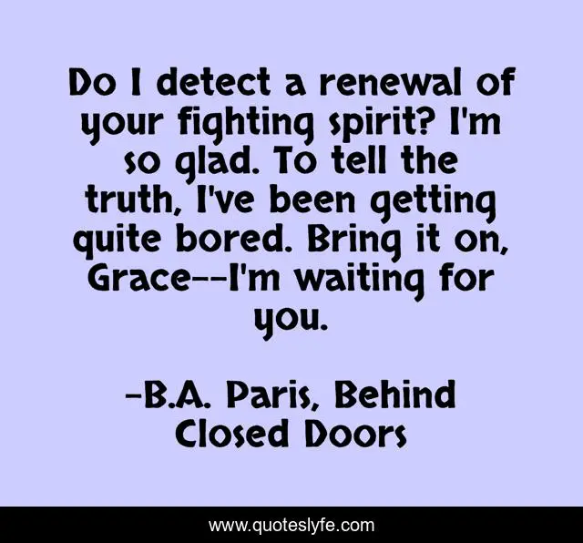 This page presents the quote "Do I detect a renewal of your fighting spirit? I'm so glad. To tell the truth, I've been getting quite bored. Bring it on, Grace--I'm waiting for you.". Author of this quote is B.A. Paris, Behind Closed Doors. This quote is about creepy, thriller,.