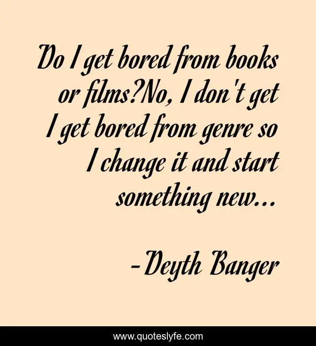 This page presents the quote "Do I get bored from books or films?No, I don't get I get bored from genre so I change it and start something new...". Author of this quote is Deyth Banger. This quote is about films, genre, story, book, new,.