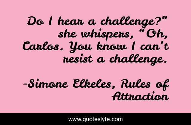 This page presents the quote "Do I hear a challenge?” she whispers, “Oh, Carlos. You know I can’t resist a challenge.". Author of this quote is Simone Elkeles, Rules of Attraction. This quote is about carlos-fuentes, challenge, kiara-westford,.