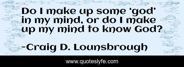 This page presents the quote "Do I make up some ‘god’ in my mind, or do I make up my mind to know God?". Author of this quote is Craig D. Lounsbrough. This quote is about manufacture, develop, knowledge, fabricate, god, create, mind, construct, imagination,.