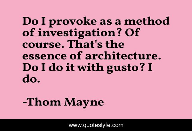 This page presents the quote "Do I provoke as a method of investigation? Of course. That's the essence of architecture. Do I do it with gusto? I do.". Author of this quote is Thom Mayne. This quote is about essence, investigation,.
