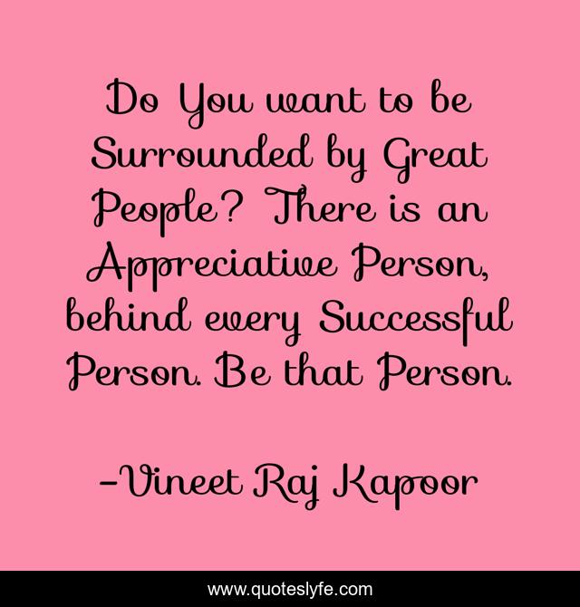 This page presents the quote "Do You want to be Surrounded by Great People? There is an Appreciative Person, behind every Successful Person. Be that Person.". Author of this quote is Vineet Raj Kapoor. This quote is about help, people, ecosystem, reality, environment, appreciation, greatness, happiness, helpful,.