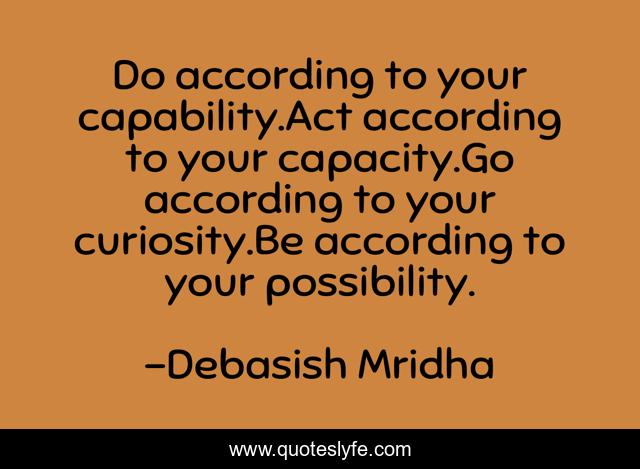 This page presents the quote "Do according to your capability.Act according to your capacity.Go according to your curiosity.Be according to your possibility.". Author of this quote is Debasish Mridha. This quote is about life, love, knowledge, inspirational, intelligence, philosophy, wisdom, quotes, affection,.