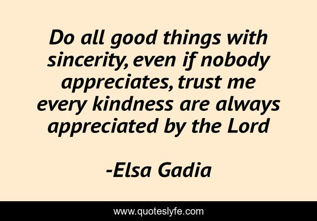 This page presents the quote "Do all good things with sincerity, even if nobody appreciates, trust me every kindness are always appreciated by the Lord". Author of this quote is Elsa Gadia. This quote is about love-and-sayings, inspiration, inspirational, trust-yourself, life-lessons, inspirational-life, enthusiasm, life-and-living, trusting-god,.