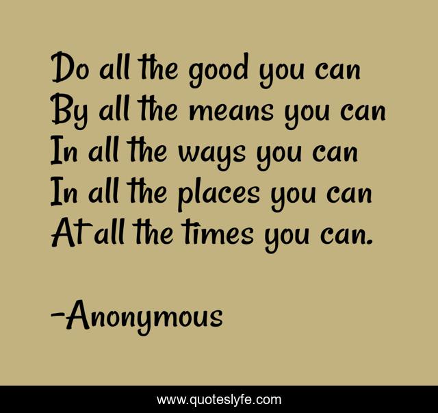This page presents the quote "Do all the good you can By all the means you can In all the ways you can In all the places you can At all the times you can.". Author of this quote is Anonymous. .
