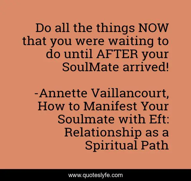 This page presents the quote "Do all the things NOW that you were waiting to do until AFTER your SoulMate arrived!". Author of this quote is Annette Vaillancourt, How to Manifest Your Soulmate with Eft: Relationship as a Spiritual Path. This quote is about how-to-manifest-your-soulmate, soul-mate, soulmates,.