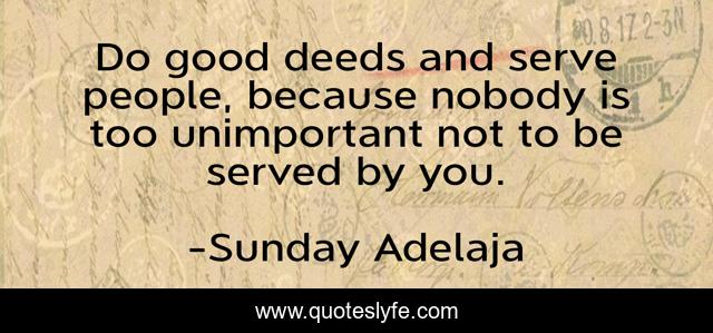 This page presents the quote "Do good deeds and serve people, because nobody is too unimportant not to be served by you.". Author of this quote is Sunday Adelaja. This quote is about good, serve,.