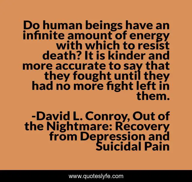 This page presents the quote "Do human beings have an infinite amount of energy with which to resist death? It is kinder and more accurate to say that they fought until they had no more fight left in them.". Author of this quote is David L. Conroy, Out of the Nightmare: Recovery from Depression and Suicidal Pain. This quote is about suicide, depression, involuntarism,.