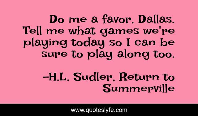 This page presents the quote "Do me a favor, Dallas. Tell me what games we're playing today so I can be sure to play along too.". Author of this quote is H.L. Sudler, Return to Summerville. This quote is about murder, romance, assasin, rehoboth-beach, south-beach, thriller,.