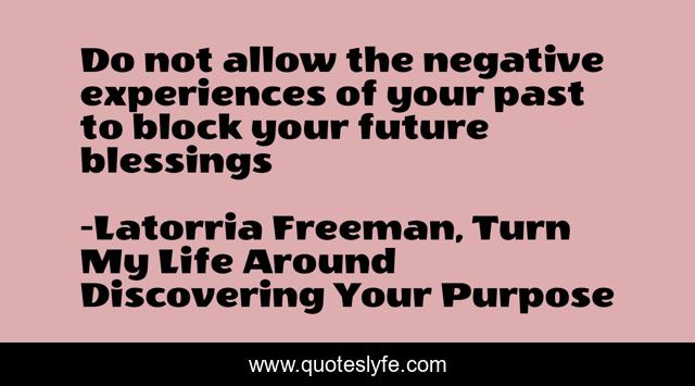This page presents the quote "Do not allow the negative experiences of your past to block your future blessings". Author of this quote is Latorria Freeman, Turn My Life Around Discovering Your Purpose. This quote is about confidence, positive, motivational, encouragement, optimistic, inspirational, enthusiasm,.