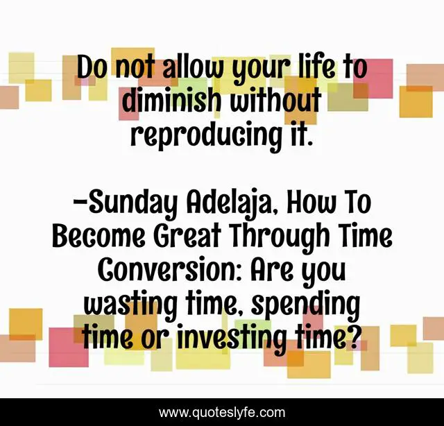 This page presents the quote "Do not allow your life to diminish without reproducing it.". Author of this quote is Sunday Adelaja, How To Become Great Through Time Conversion: Are you wasting time, spending time or investing time?. This quote is about life, diminishing-life, reproductive-life, conversion, productivity, wealth, greatness, waste, humanity,.