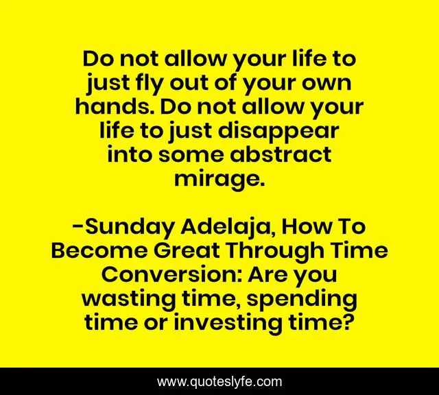 This page presents the quote "Do not allow your life to just fly out of your own hands. Do not allow your life to just disappear into some abstract mirage.". Author of this quote is Sunday Adelaja, How To Become Great Through Time Conversion: Are you wasting time, spending time or investing time?. This quote is about life-wastage, wasting-life, life, mirage, conversion, productivity, wealth, greatness, waste,.