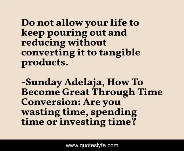 This page presents the quote "Do not allow your life to keep pouring out and reducing without converting it to tangible products.". Author of this quote is Sunday Adelaja, How To Become Great Through Time Conversion: Are you wasting time, spending time or investing time?. This quote is about great, productivity, wealth, gift, products, work, life, convert, value,.