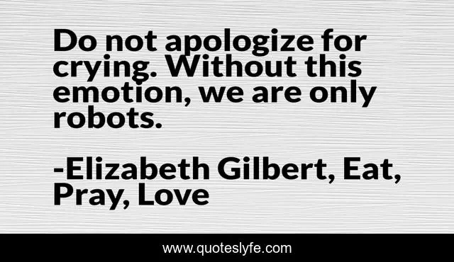 This page presents the quote "Do not apologize for crying. Without this emotion, we are only robots.". Author of this quote is Elizabeth Gilbert, Eat, Pray, Love. This quote is about sorrow, crying,.