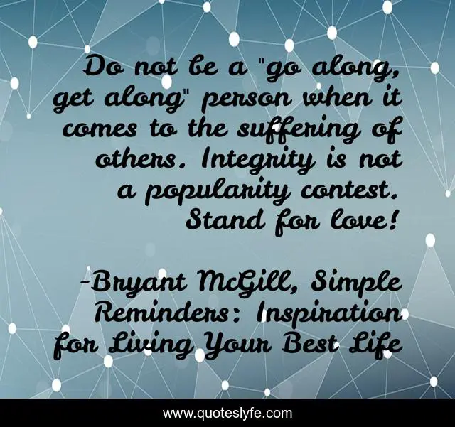 This page presents the quote "Do not be a "go along, get along" person when it comes to the suffering of others. Integrity is not a popularity contest. Stand for love!". Author of this quote is Bryant McGill, Simple Reminders: Inspiration for Living Your Best Life. This quote is about integrity, suffering, popularity, love, affection,.