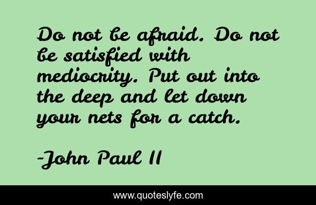This page presents the quote "Do not be afraid. Do not be satisfied with mediocrity. Put out into the deep and let down your nets for a catch.". Author of this quote is John Paul II. This quote is about enthusiasm, gospel, courage, inspirational,.