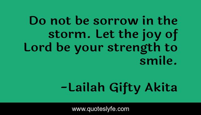 This page presents the quote "Do not be sorrow in the storm. Let the joy of Lord be your strength to smile.". Author of this quote is Lailah Gifty Akita. This quote is about faith, strength, inspirational, movtivational, hope, storm, smile, enthusiasm, happiness,.