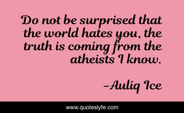 This page presents the quote "Do not be surprised that the world hates you, the truth is coming from the atheists I know.". Author of this quote is Auliq Ice. This quote is about hatred, truth-of-life, truth, auliq-ice,.