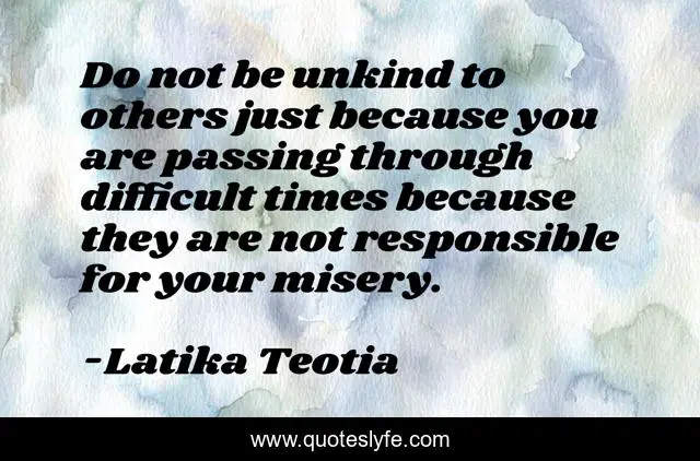 This page presents the quote "Do not be unkind to others just because you are passing through difficult times because they are not responsible for your misery.". Author of this quote is Latika Teotia. This quote is about life, inspirational, motivational-inspirational, latika-teotia, inspirational-living, enthusiasm,.