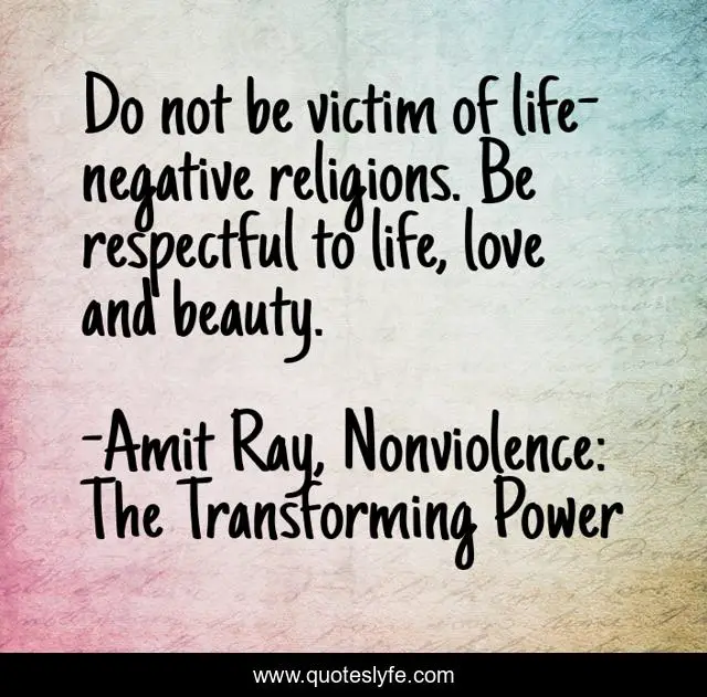 This page presents the quote "Do not be victim of life-negative religions. Be respectful to life, love and beauty.". Author of this quote is Amit Ray, Nonviolence: The Transforming Power. This quote is about life, love, respectful, beauty, positive-affirmation, positive-thinking, religion, positive-thoughts, respect,.
