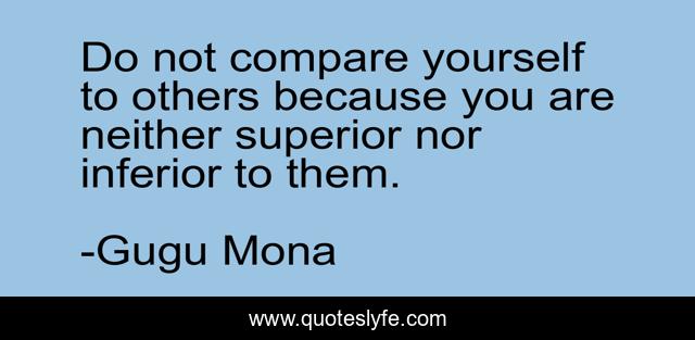 This page presents the quote "Do not compare yourself to others because you are neither superior nor inferior to them.". Author of this quote is Gugu Mona. This quote is about life-philosophy, compare, others, inferior, superior,.