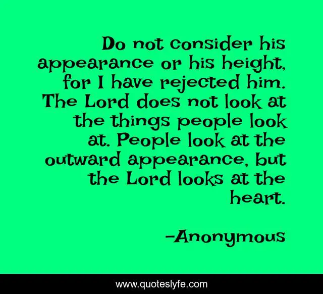 This page presents the quote "Do not consider his appearance or his height, for I have rejected him. The Lord does not look at the things people look at. People look at the outward appearance, but the Lord looks at the heart.". Author of this quote is Anonymous. This quote is about faith, confidence, beauty, apperance, god, religion, bible-verse, worship,.