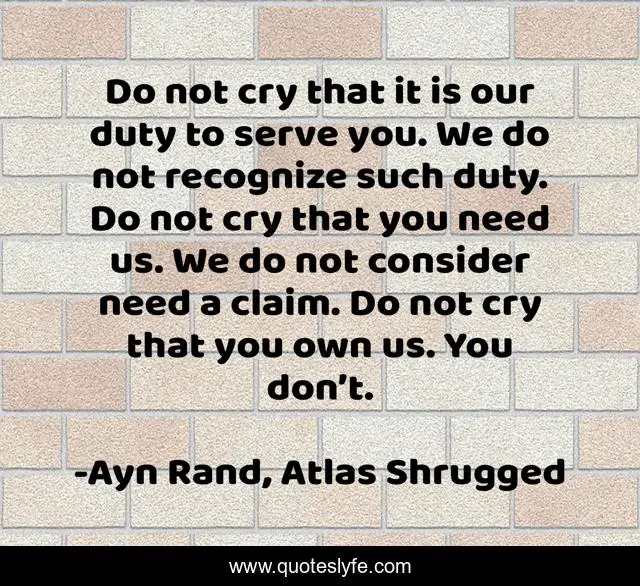 This page presents the quote "Do not cry that it is our duty to serve you. We do not recognize such duty. Do not cry that you need us. We do not consider need a claim. Do not cry that you own us. You don’t.". Author of this quote is Ayn Rand, Atlas Shrugged. This quote is about life, morals, philosophy, values, atlas-shrugged, john-galt, man,.