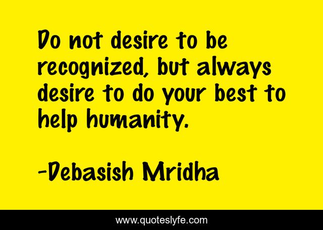 This page presents the quote "Do not desire to be recognized, but always desire to do your best to help humanity.". Author of this quote is Debasish Mridha. This quote is about help-humanity, do-your-best, philosophy, debasish-mridha, debasish-mridha-m-d, quotes, inspirational, do-not-desire-to-be-recognized, enthusiasm,.