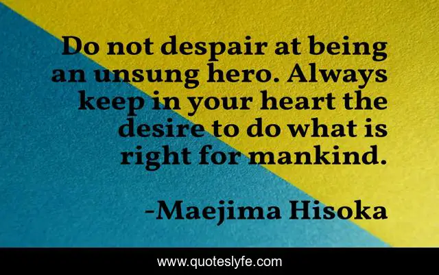 This page presents the quote "Do not despair at being an unsung hero. Always keep in your heart the desire to do what is right for mankind.". Author of this quote is Maejima Hisoka. This quote is about unsung, what-is-right, hero, mankind,.