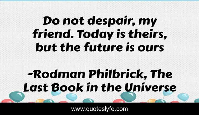 This page presents the quote "Do not despair, my friend. Today is theirs, but the future is ours". Author of this quote is Rodman Philbrick, The Last Book in the Universe. .