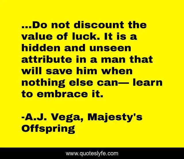 This page presents the quote "…Do not discount the value of luck. It is a hidden and unseen attribute in a man that will save him when nothing else can— learn to embrace it.". Author of this quote is A.J. Vega, Majesty's Offspring. .