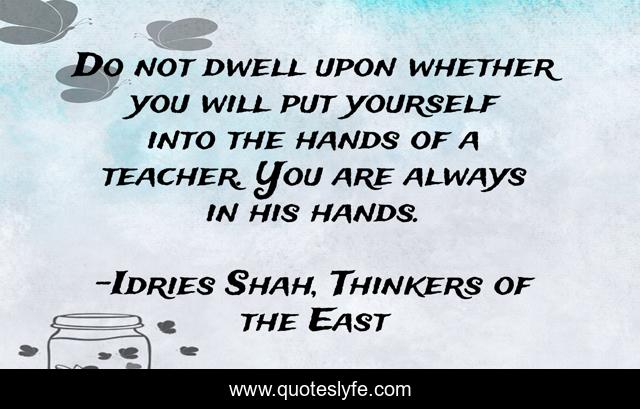 This page presents the quote "Do not dwell upon whether you will put yourself into the hands of a teacher. You are always in his hands.". Author of this quote is Idries Shah, Thinkers of the East. This quote is about tasawwuf, bahaudin-naqshband, sufism, bahaudin, sufis, sufi-teacherer,.