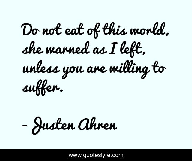 This page presents the quote "Do not eat of this world, she warned as I left, unless you are willing to suffer.". Author of this quote is Justen Ahren. .