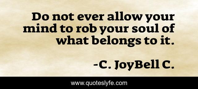 This page presents the quote "Do not ever allow your mind to rob your soul of what belongs to it.". Author of this quote is C. JoyBell C.. This quote is about life, warnings, mind, mind-and-soul, soul, life-lessons,.