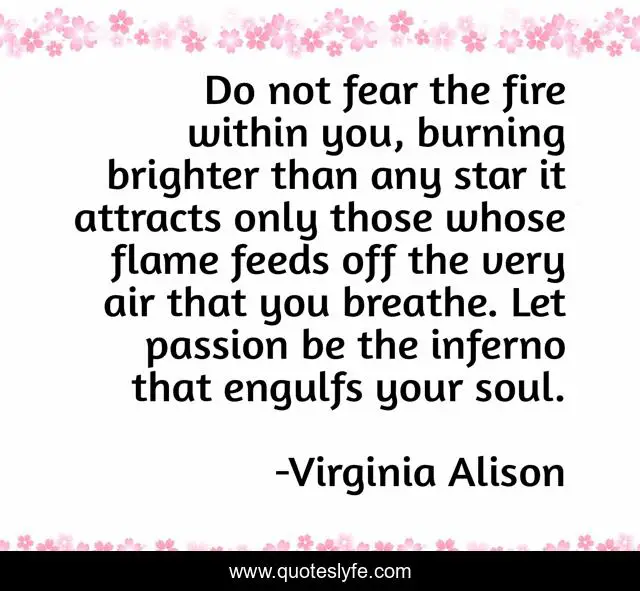 This page presents the quote "Do not fear the fire within you, burning brighter than any star it attracts only those whose flame feeds off the very air that you breathe. Let passion be the inferno that engulfs your soul.". Author of this quote is Virginia Alison. This quote is about fire, desire-burning-bright, inferno, passion, soul,.