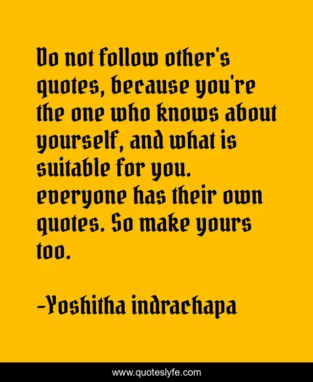 This page presents the quote "Do not follow other's quotes, because you're the one who knows about yourself, and what is suitable for you. everyone has their own quotes. So make yours too.". Author of this quote is Yoshitha indrachapa. .