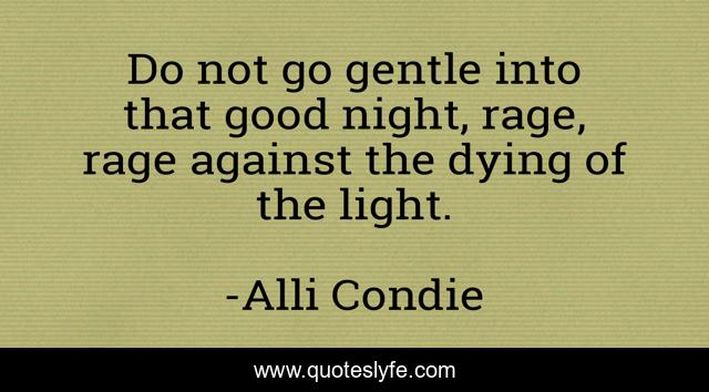This page presents the quote "Do not go gentle into that good night, rage, rage against the dying of the light.". Author of this quote is Alli Condie. This quote is about poem, dylan-thomas, matched,.