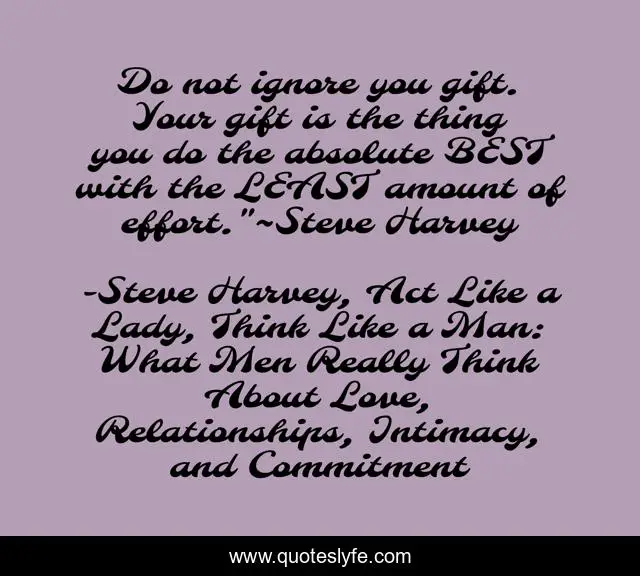 "Steve Harvey, Act Like a Lady, Think Like a Man: What Men Really Think About Love, Relationships, Intimacy, and Commitment Quotes." Quoteslyfe.com, 2025. Mon. 08 Dec. 2025. <https://www.quoteslyfe.com/quote/Do-not-ignore-you-gift-Your-gift-14005>.